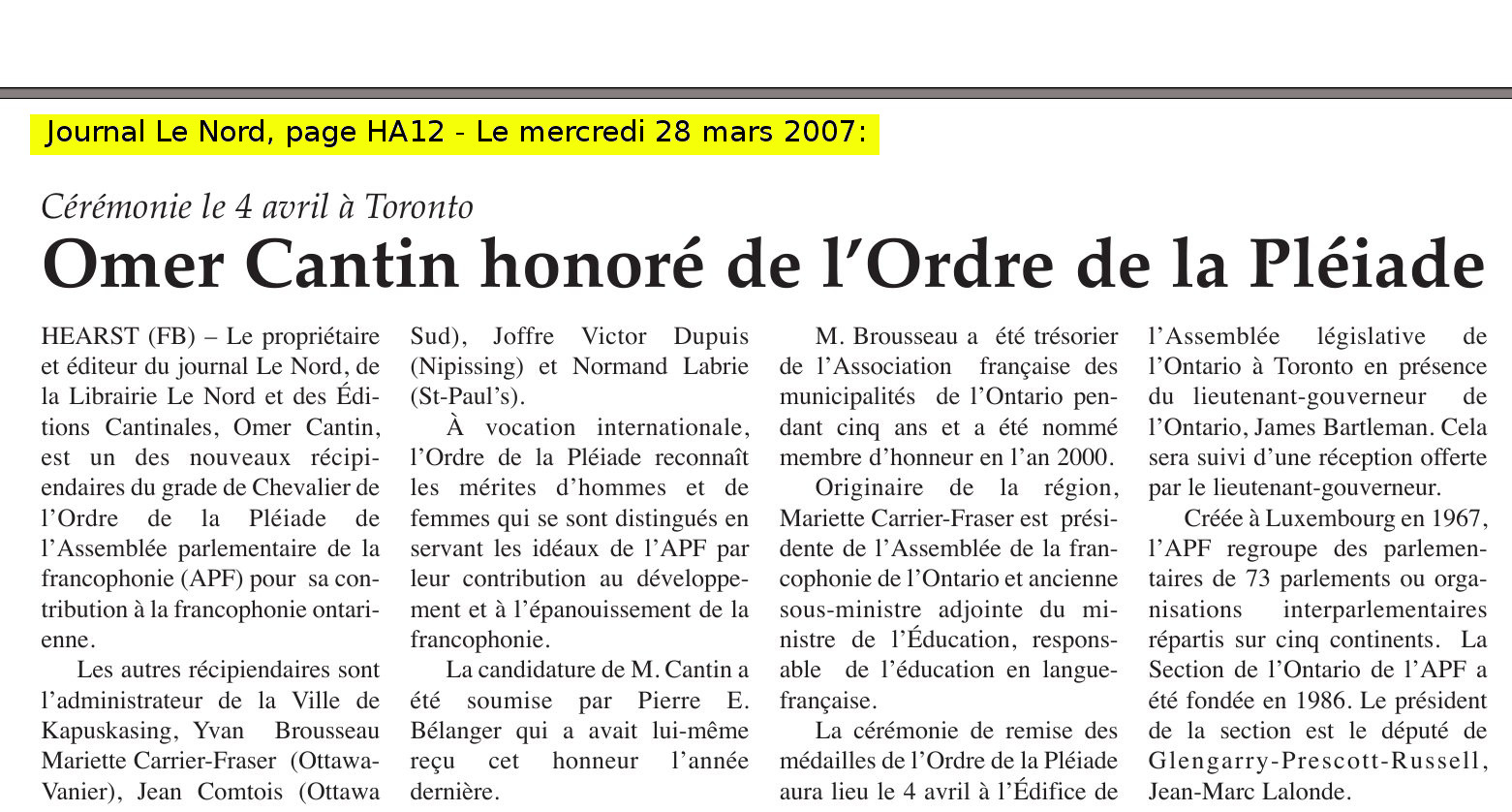 Nous voyons qu'au tout début, même s'il n'était pas en charge, Omer était impliqué dans le journal, et y travaillait comme journaliste dès son lancement. Pendant ses premières années le journal était un organisme communautaire, avec un conseil d'administration, composé de gens d'affaire de la place (Roland Lacroix, marié à Denise Pominville, a fait parti de ce conseil d'administration; voir HistoriquePominville!). En 1988, Omer Cantin, avec Raymond Alary et Louis Corbeil, prennent contrôle des actions. Cinq ans plus tard, en 1993, Omer Cantin en devient propriétaire, jusqu'en 2016 quand le journal est vendu au groupe Les médias de l'épinette noire inc. Ces information nous viennent du Centre d'archives de la Grande Zone argileuse, au http://www.uhearst.ca/archives/index.php/journal-le-nord. De plus le Centre d'archives de la Grande Zone argileuse possède une collection impressionante des éditions du journal Le Nord. En voici sa description: La collection contient 60 volumes reliés ainsi que six boîtes de journaux. De 1976 à 2009, les journaux ont été reliés. Depuis 2010, les journaux sont préservés individuellement. Le contenu du journal est répertorié de la première parution en 1976 jusqu'en 2012. Pour la période allant de 1976 à 1992, il existe deux index format papier. Ces index sont disponibles au Centre d'archives de la Grande Zone argileuse et à labibliothèque Maurice-Saulnier. Un index numérique (FileMaker) couvrant la période allant de 1993 à 2012, est disponible à l'adresse suivante: http://www.uhearst.ca/base-de-donnees-le-nord. Lesjournaux sont accessibles intégralement en format numérique depuis 2005, dans la section des bases de données du site de la bibliothèque Maurice-Saulnier de l'Université de Hearst. Toutefois, les articles ne sont pas indexés. Une collection incomplète des cahiers spéciaux publiés par le journal Le Nord, existe également. On y retrouve des cahiers publiés entre 1976 et 2015. L'archive des éditions numérique du journal sont disponible au http://www.uhearst.ca/journal-le-nord.