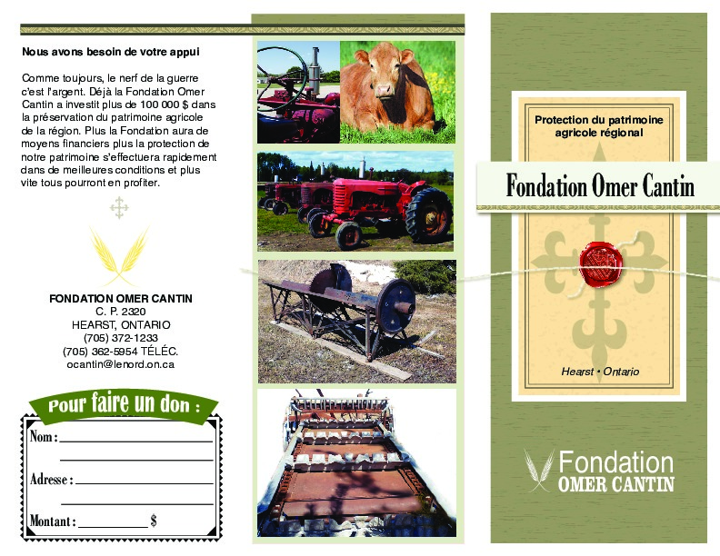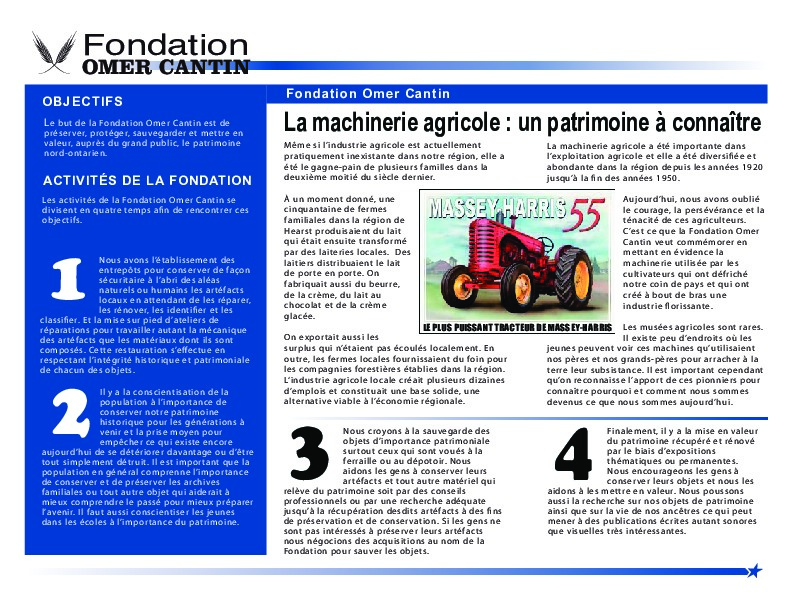En 2017, le journal Le Nord plubliait un article sur La Fondation Omer Cantin; nous avons incorporé une copie de cette article dans cette page. La Fondation Omer Cantin n'a pas encore été formellement accepté comme organisme de charité, mais c'est planifié. L'article de Sébastien Pierroz mentionné au début de cette page résume bien les buts de La Fondation Omer Cantin: Je trouvais que l'on avait perdu beaucoup au niveau agricole. Une génération complète ne connaissait rien à ce niveau-là. On voulait montrer que l'agriculture a tenu une place importante. L'idée est un peu de recréer une ferme du début du 20e siècle avec de la machinerie agricole sur ces fermes, pour montrer l'habileté et l'opiniâtreté de cette génération-là qui travaillait des longues heures tous les jours, avec des moyens que l'on n'a pas aujourd'hui, et qui réussissait à élever de grosses familles. (Omer Cantin, octobre 2020)